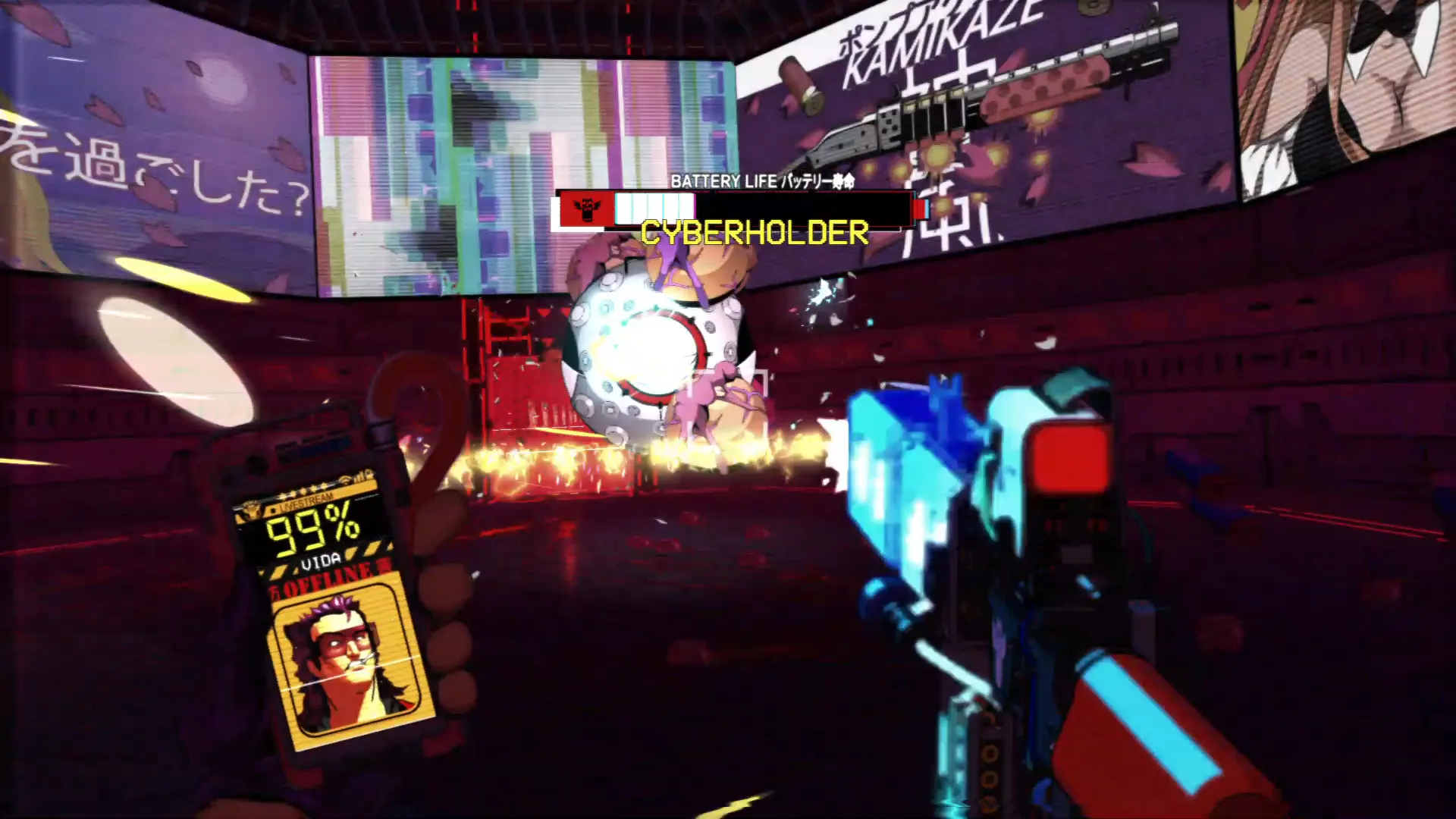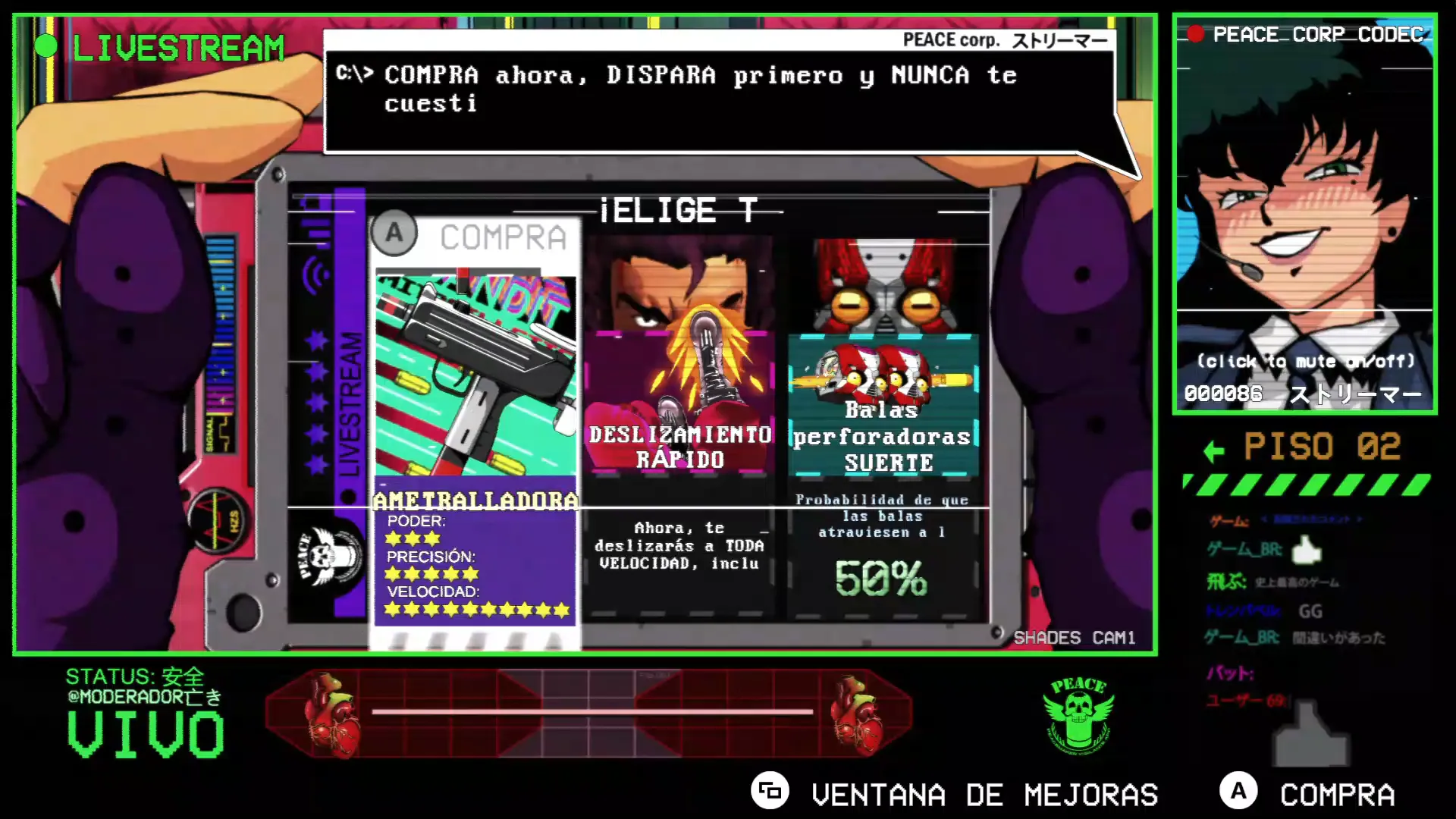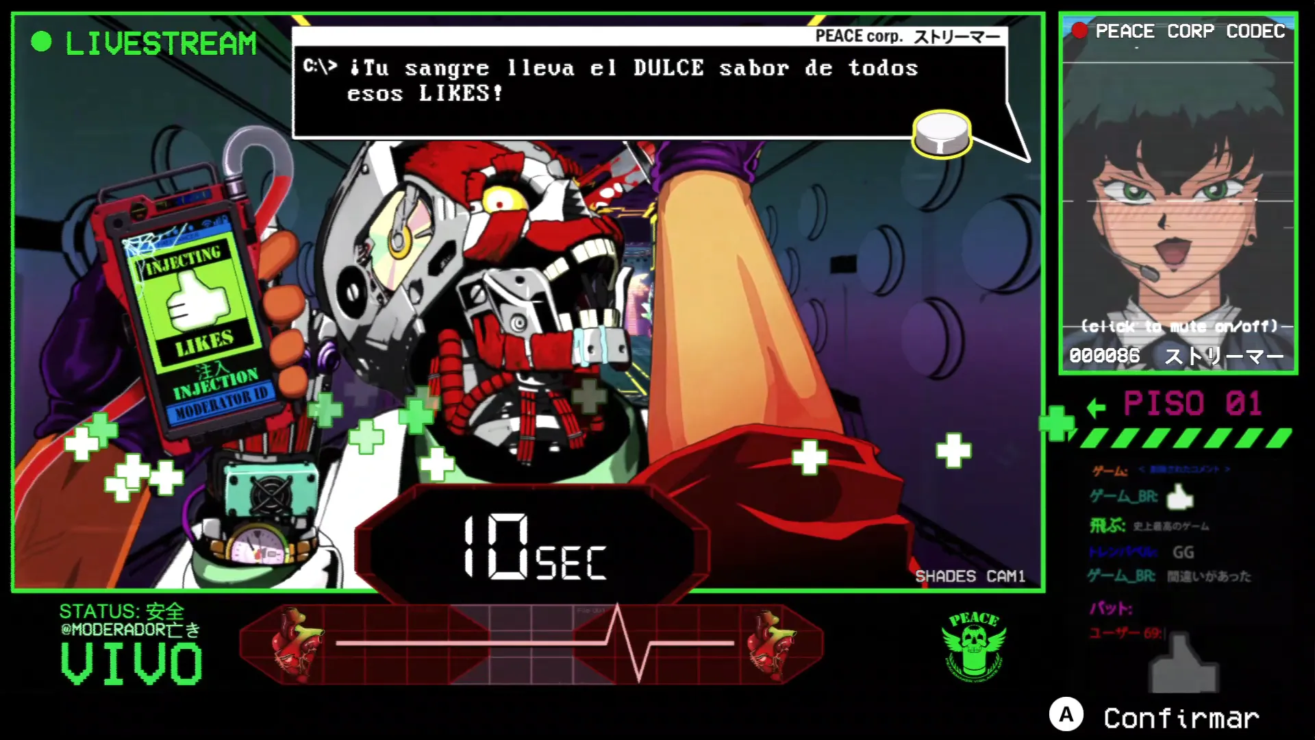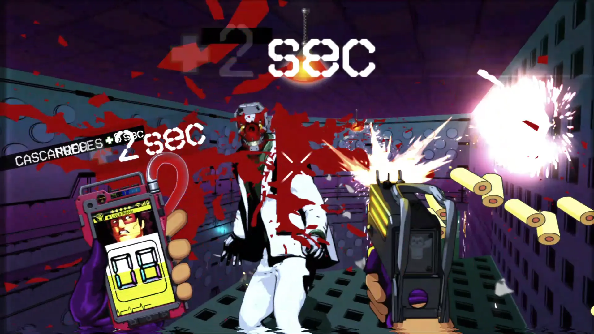 El concepto de tener 10 segundos de vida y que se recargue matando enemigos es muy interesante. Y si a eso le añades un lore que justifica esas mecánicas, como es el hecho de que los humanos necesitemos dopamina constante en el futuro, y que estés en directo en un stream de un concurso por conseguir unas zapatillas nuevas, se vuelve una genialidad.